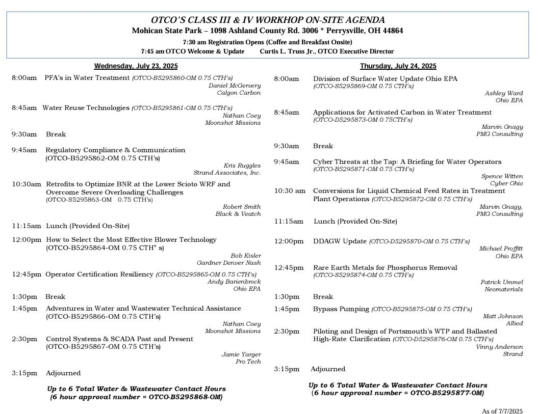 The Class III & IV Workshop / Webinar is approved to fulfill the contact hour requirements for the following Ohio EPA Certified Operators:
